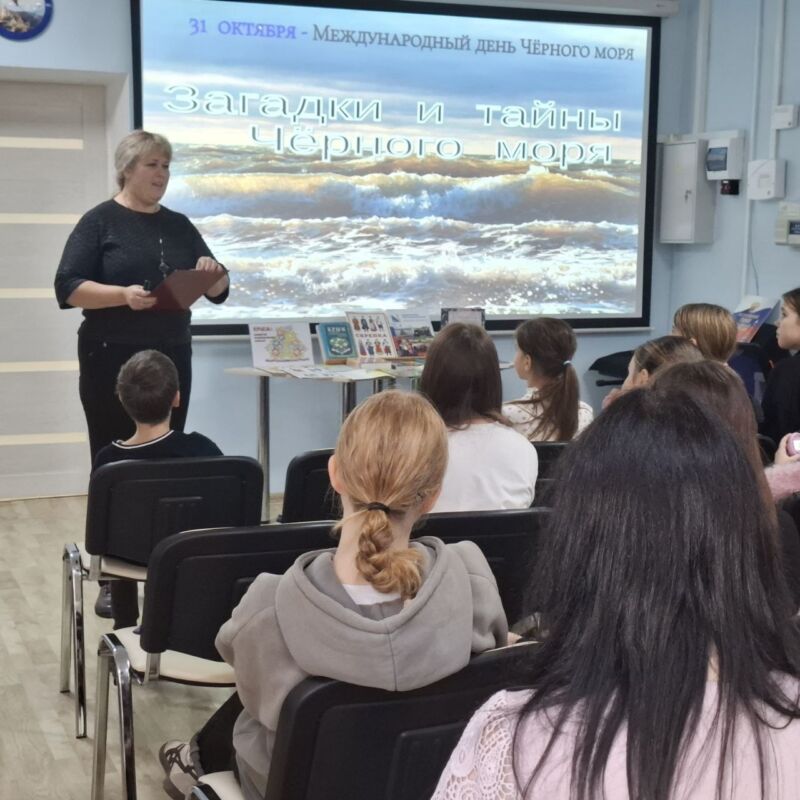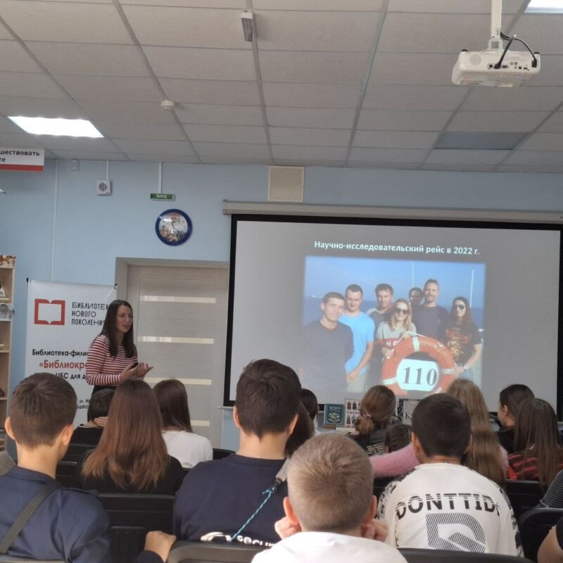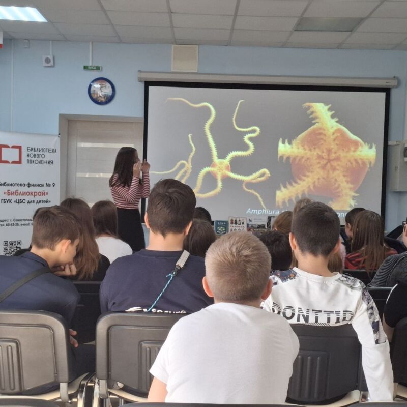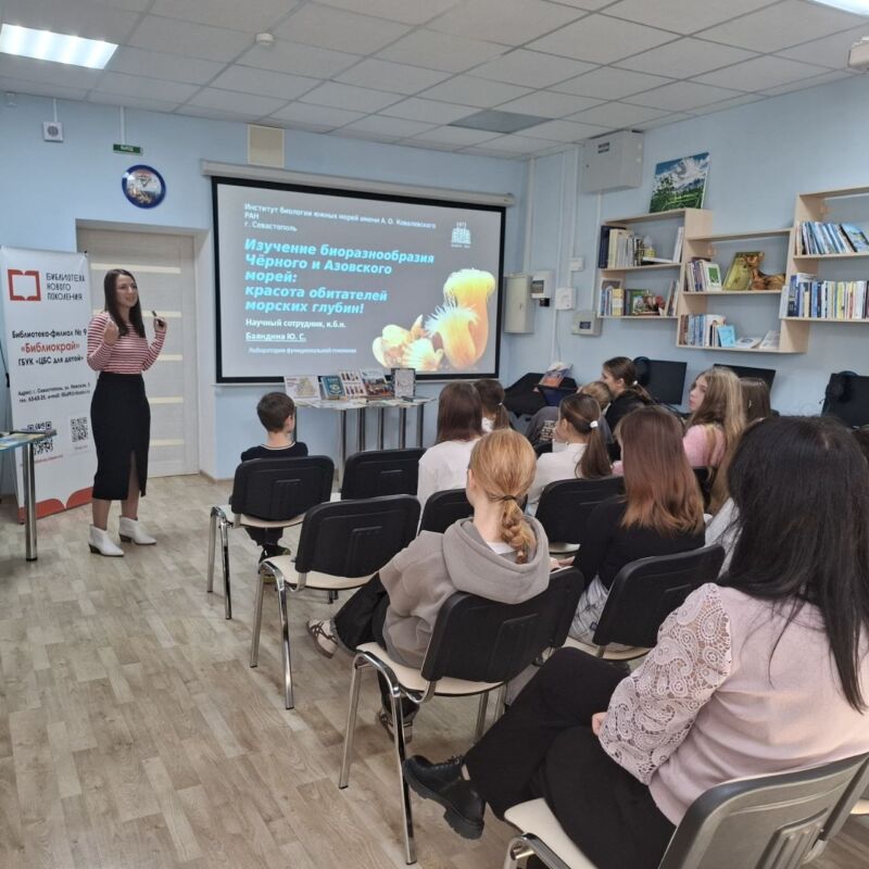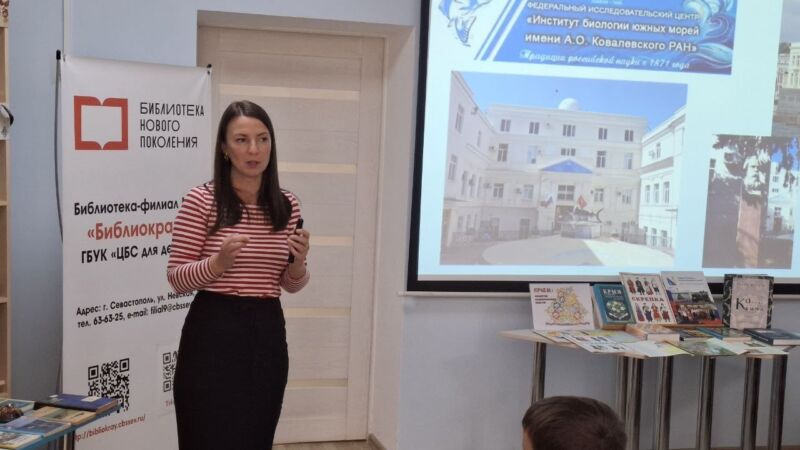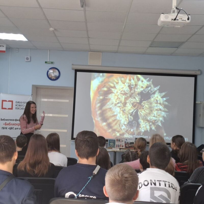 И в честь этого события читатели 6-А класса школы N 30 и классный руководитель Орлова Яна Валериевна пришли в «Библиокрай «на уникальную встречу с научным сотрудником лаборатории функциональной геномики Федерального исследовательского центра «Института биологии южных морей имени А.О.Ковалевского.