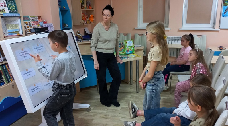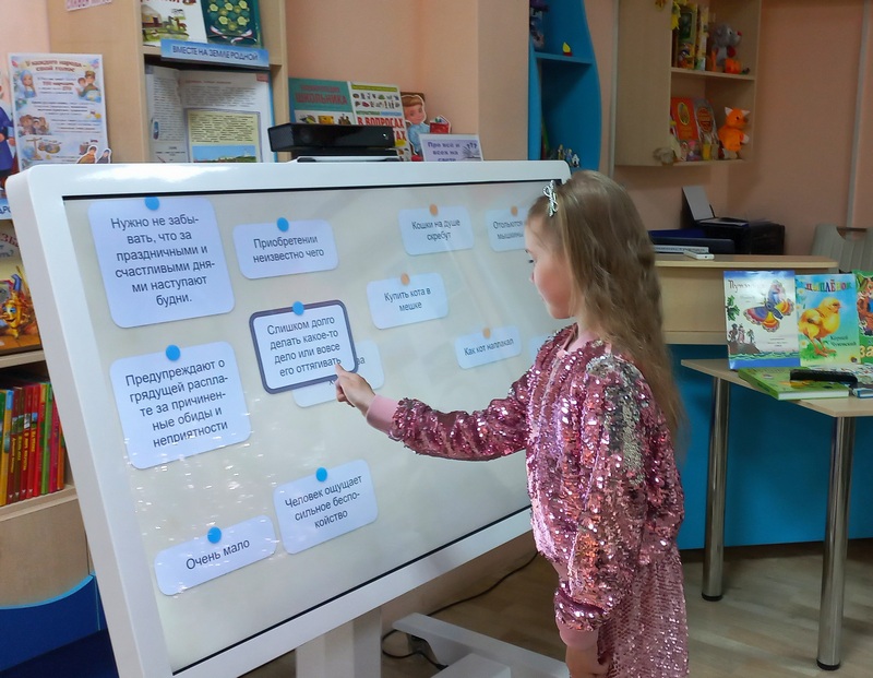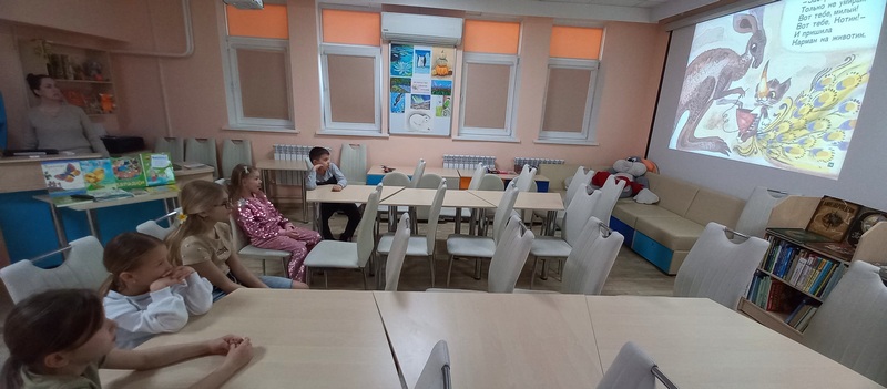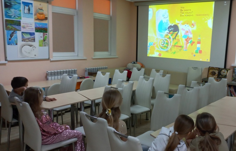 В начале библиотекарь рассказала про диафильмы. Наши юные читатели узнали, что советской студии, которая делала диафильмы и так и называлась: «Диафильм» уже не существует, что диафильмы появились в начале 30-х годов. Первыми экранизированными книжками стали стихи C. Я. Маршака и А. Л. Барто.