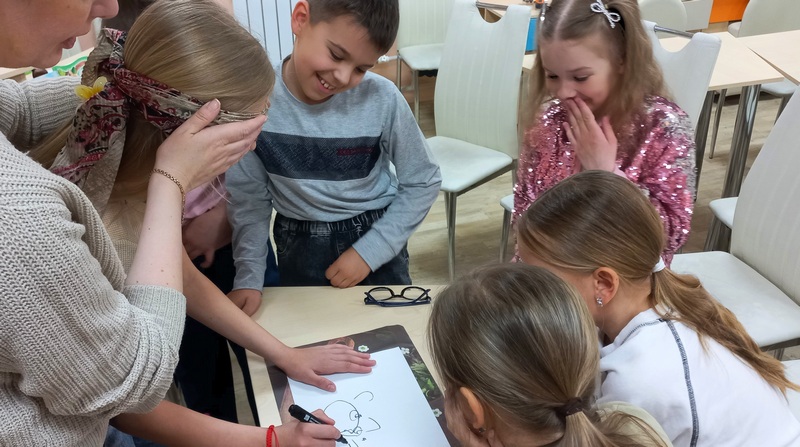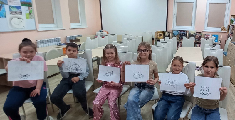 Конечно же, мы не могли забыть про Мурзика, и было решено изобразить полюбившегося кота, только необычным образом, а именно с закрытыми глазами. Такой способ рисования никого не оставил равнодушным, конкурс всем поднял настроение и вызвал много улыбок. Ни один кот не был похож на другого, ребята забрали свои шедевры себе на память.