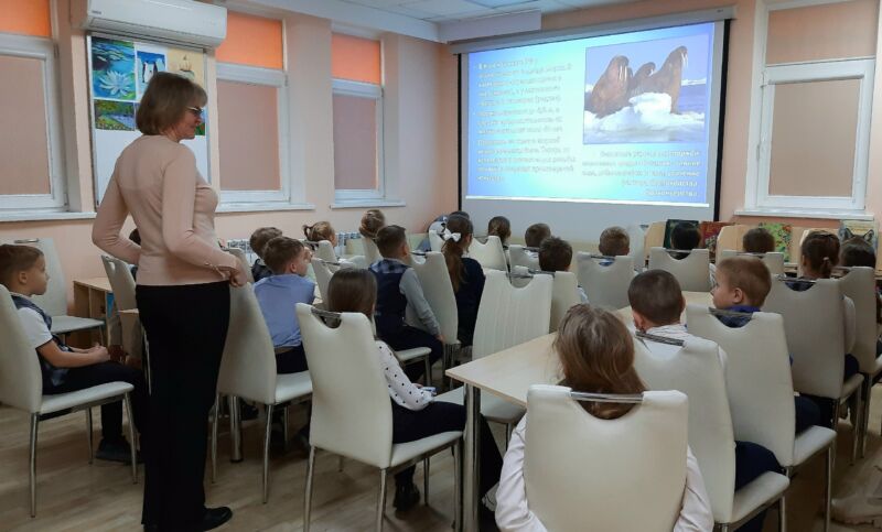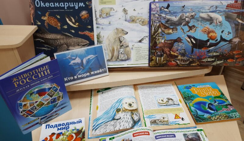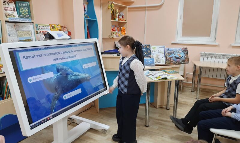 Юные читатели погрузились в удивительный мир обитателей морей и океанов, узнав интересные факты о таких представителях фауны, как морж, сивуч, байкальская нерпа, горбатый кит, косатка, калан и нарвал.